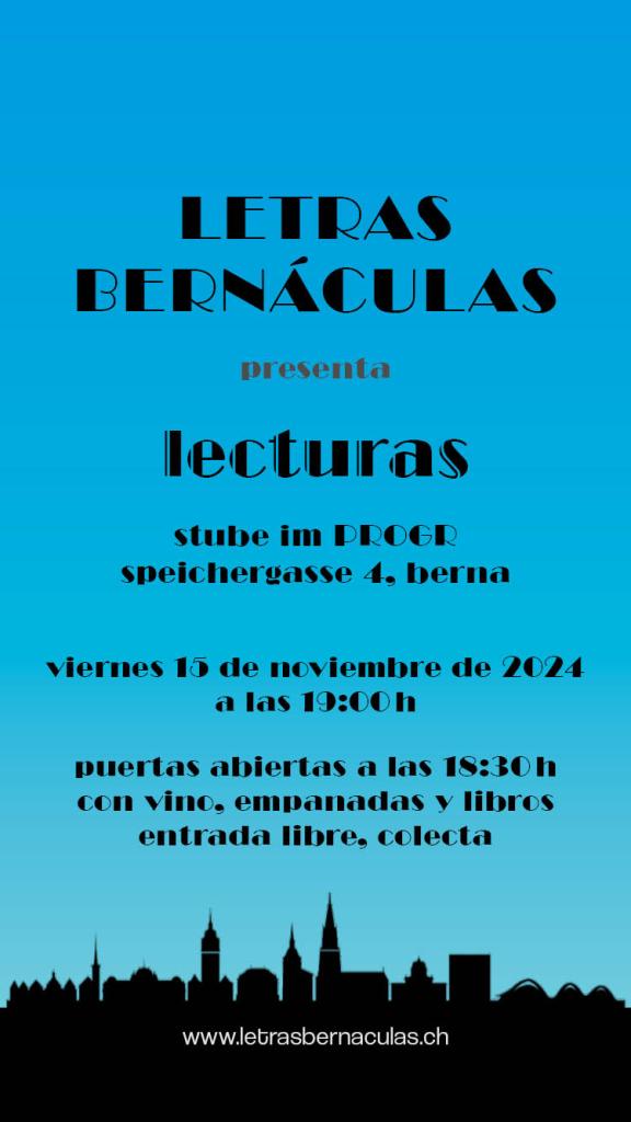 En Suiza, el otoño se afianza, las noches se alargan y Letras Bernáculas se prepara para una velada de nuevas lecturas. El viernes 15 de noviembre a las 19 horas estaremos en Stube im PROGR (Speichergasse 4, 3011 Berna) para una velada de narrativa y poesía. Desde las 18:30 abriremos las puertas. Habrá venta de vino, empanadas y libros de los autores. Si no la tienes aún, podrás adquirir la Antología 2012-2022 del grupo.