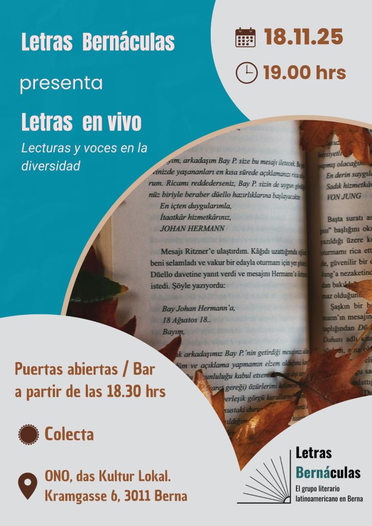 El próximo 18 de noviembre de 2025, a las 19:00 horas, el espacio ONO, das Kultur Lokal (Kramgasse 6, 3011 Berna) abrirá sus puertas para recibir a quienes disfrutan de la palabra viva. Desde las 18:30 horas, el bar estará disponible para acompañar la espera con una copa, empanadas y una charla previa entre los asistentes.